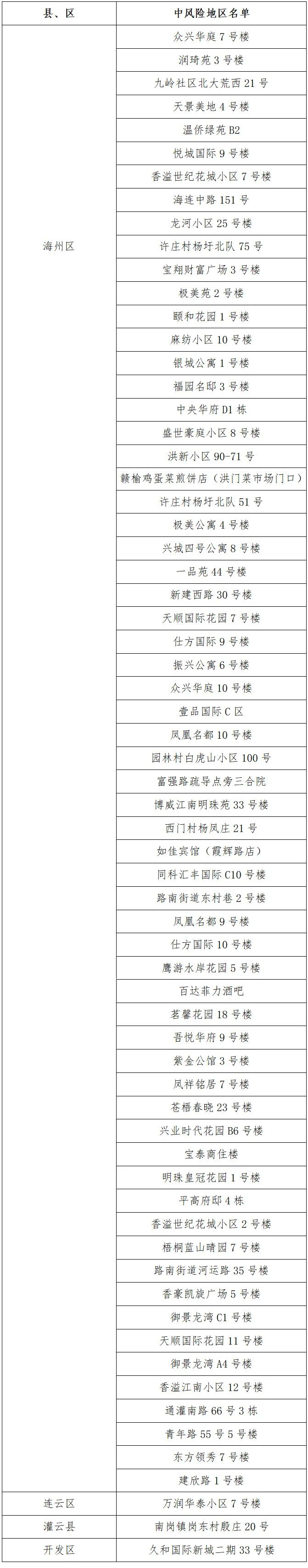 根據國務院聯防聯控機制有關規定,經綜合評估研判,市指揮部決定,自發布之日起,將海州區茗馨花園18號樓、吾悅華府9號樓、紫金公館3號樓、鳳祥銘居7號樓、蒼梧春曉23號樓、興業時代花園B6號樓、寶泰商住樓、明珠皇冠花園1號樓、平高府邸4棟、香溢世紀花城小區2號樓、梧桐藍山晴園7號樓、路南街道河運路35號樓、香豪凱旋廣場5號樓、御景龍灣C1號樓、天順國際花園11號樓、御景龍灣A4號樓、香溢江南小區12號樓、通灌南路66號3棟、青年路55號5號樓、東方領秀7號樓、建欣路1號樓調整為中風險地區。其他地區風險等級不變。調整后全市現有66個中風險地區。