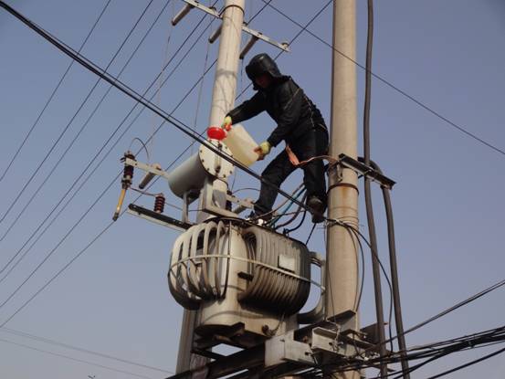 圖為維護人員正在為居民生活區的變壓器進行加油