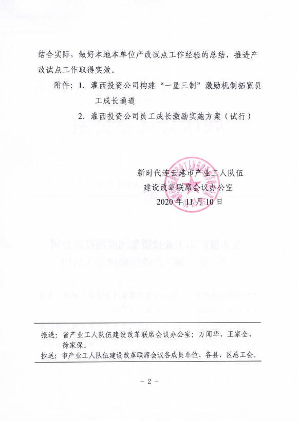 1120日,新時(shí)代連云港市產(chǎn)業(yè)工人隊(duì)伍建設(shè)改革聯(lián)席會(huì)議辦公室在全市推廣工投集團(tuán)灌西投資公司“一星三制”產(chǎn)改經(jīng)驗(yàn)。
