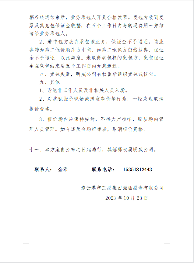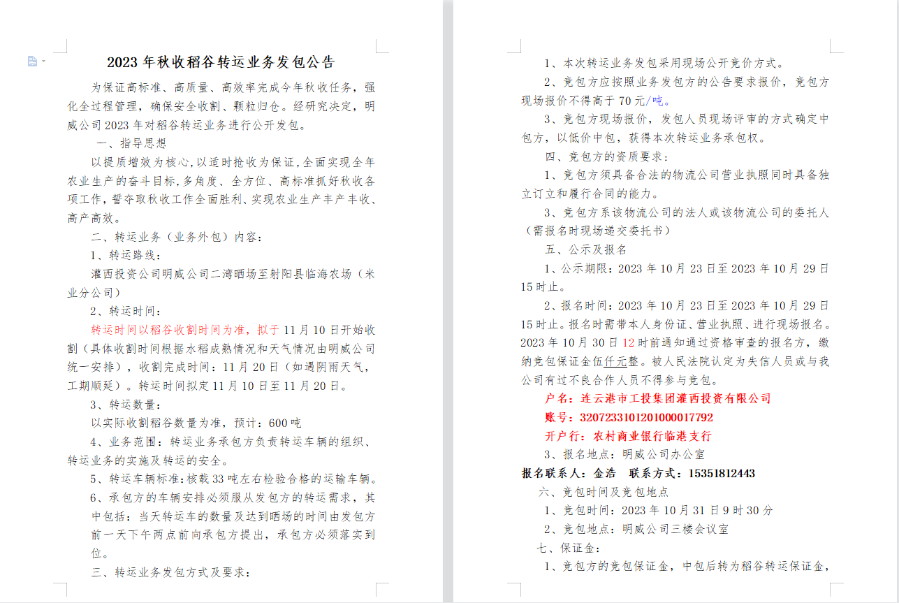 2023年秋收稻谷轉(zhuǎn)運(yùn)業(yè)務(wù)發(fā)包公告
