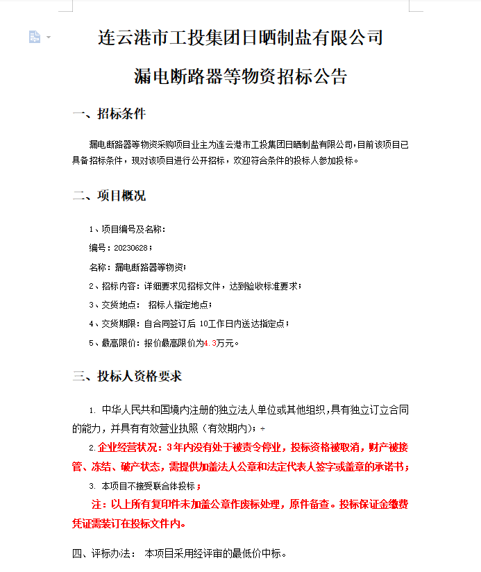 連云港市工投集團日曬制鹽有限公司漏電斷路器等物資招標公告