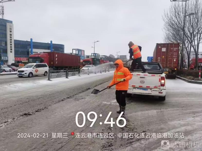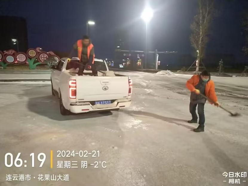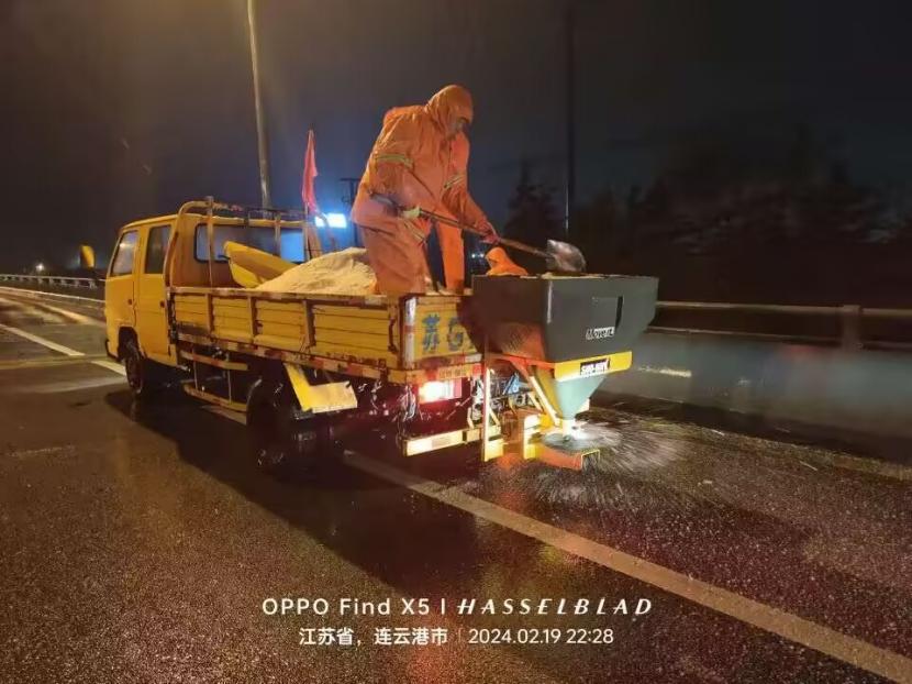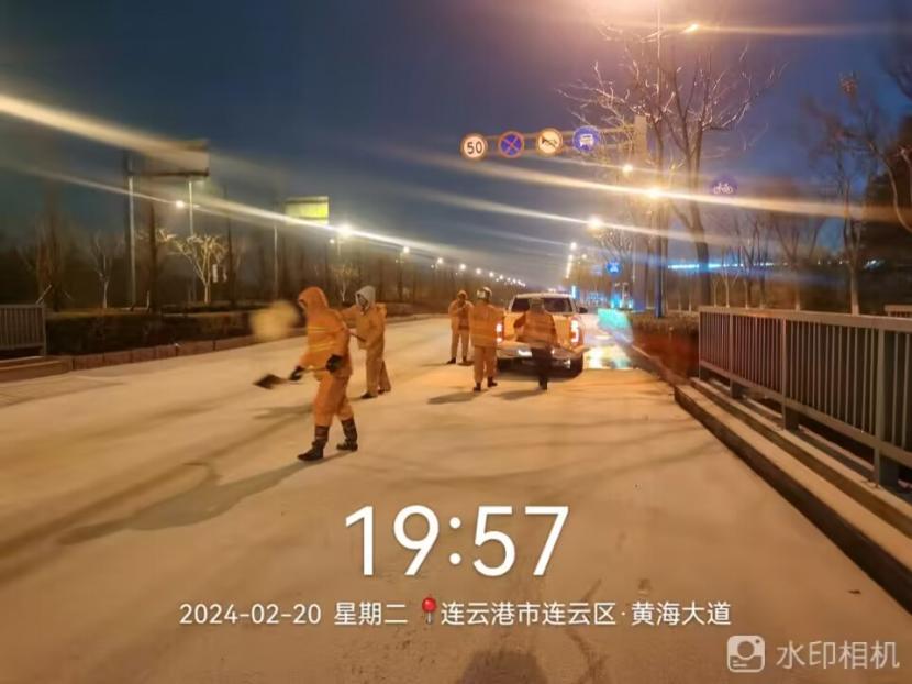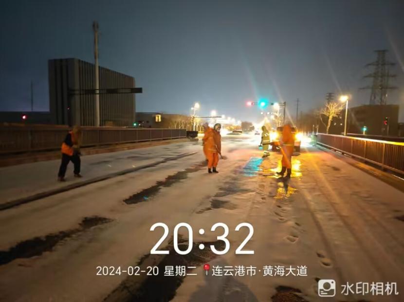 夜晚10點,在黃海大道,支部書記范曉寶親自帶隊,帶領張巖、盛小雷、薛加兵等6名黨員,冒雪奮戰、連續作業,融雪劑,進行緊急除雪除冰作業